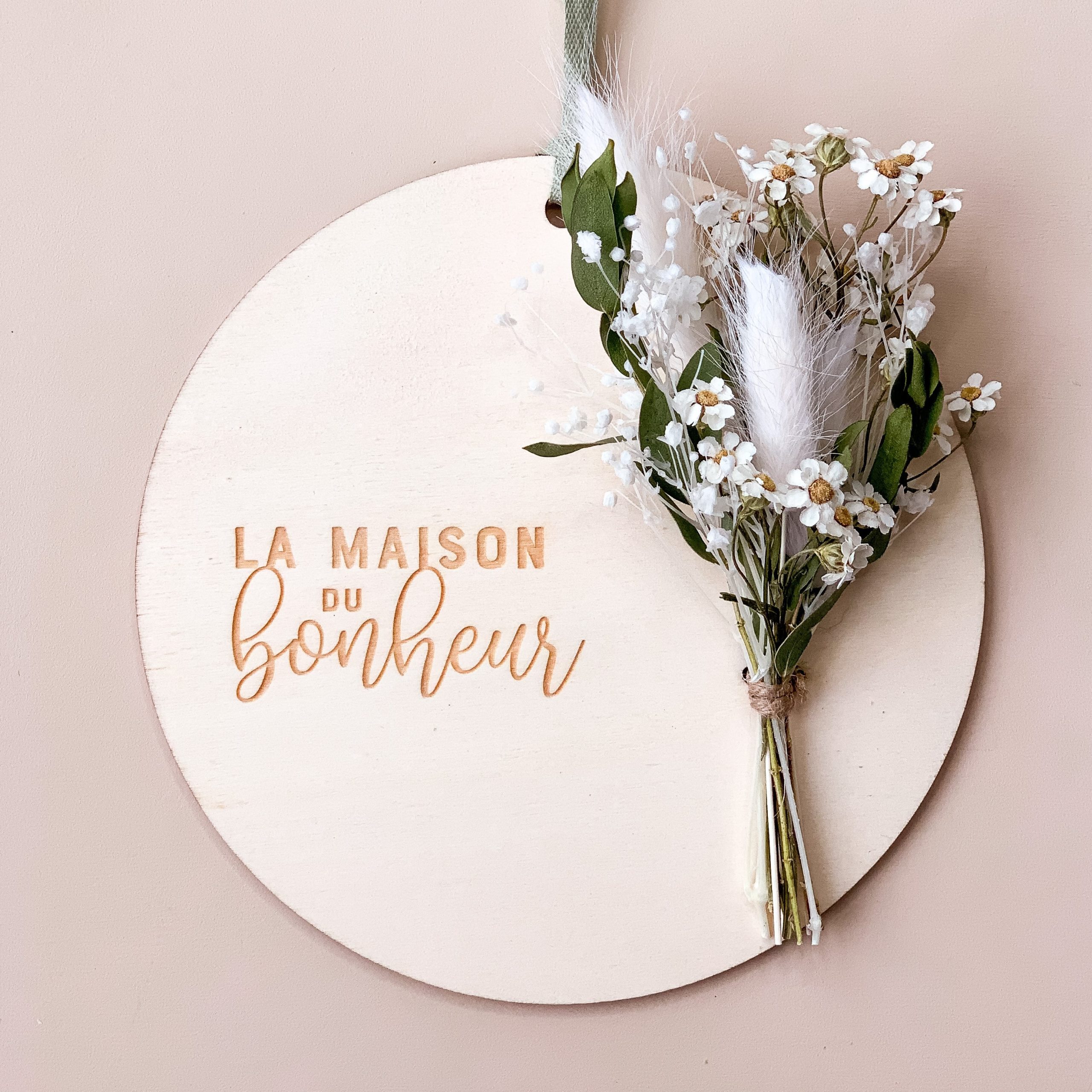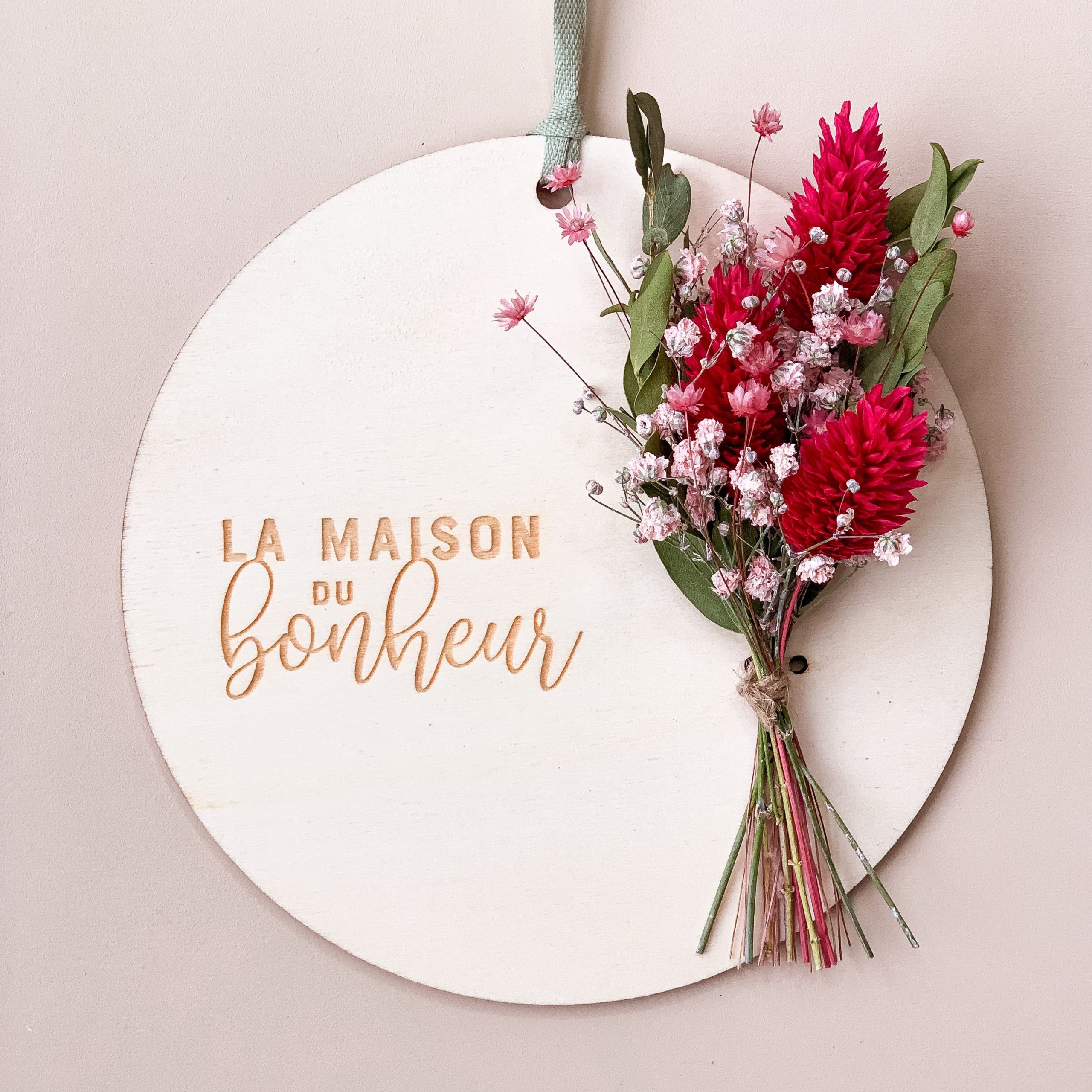 Cette jolie carte en bois est composée d’un délicat message "La Maison du Bonheur" et d'un bouquet de fleurs séchées aux couleurs de votre choix : nature, blanc, jaune ou rose !