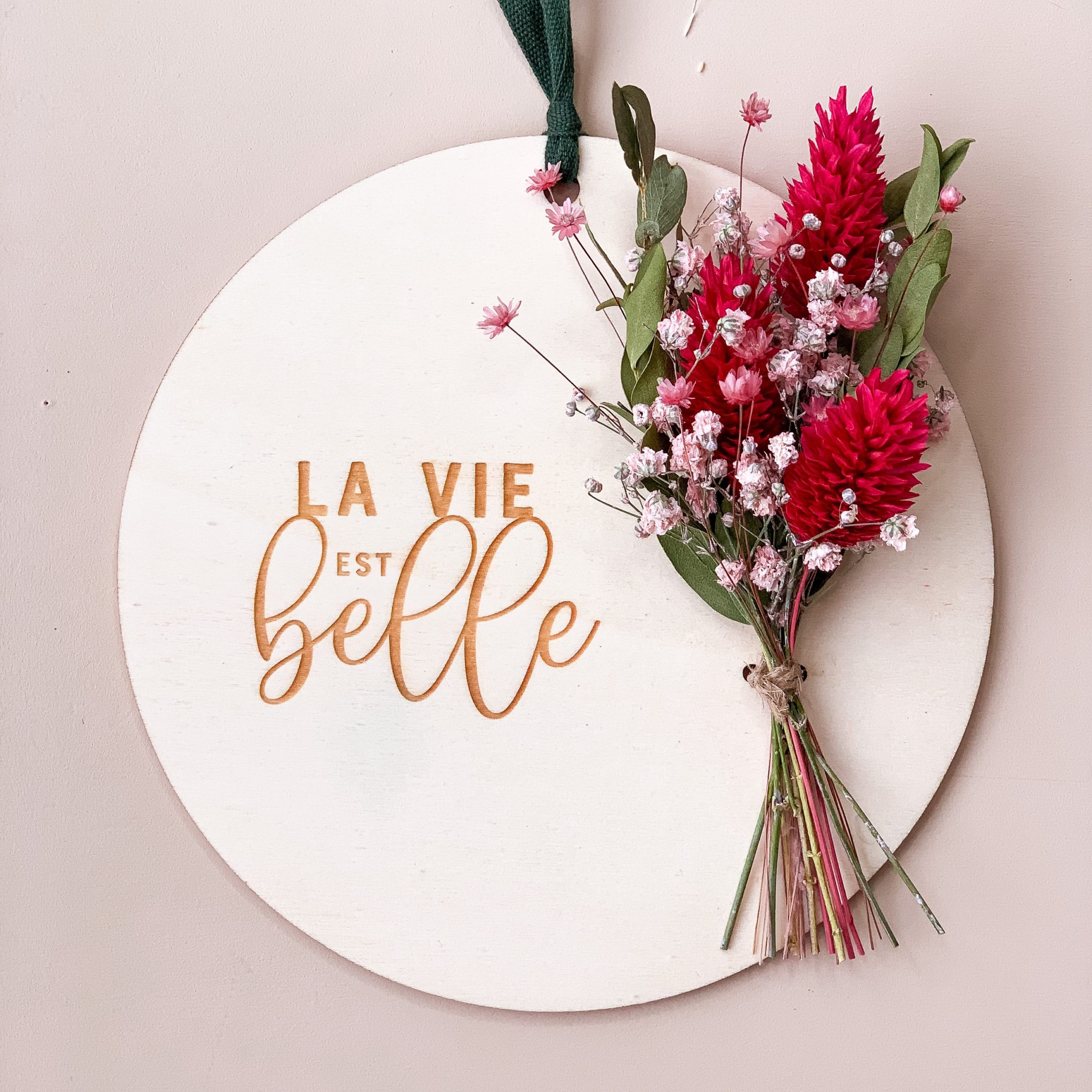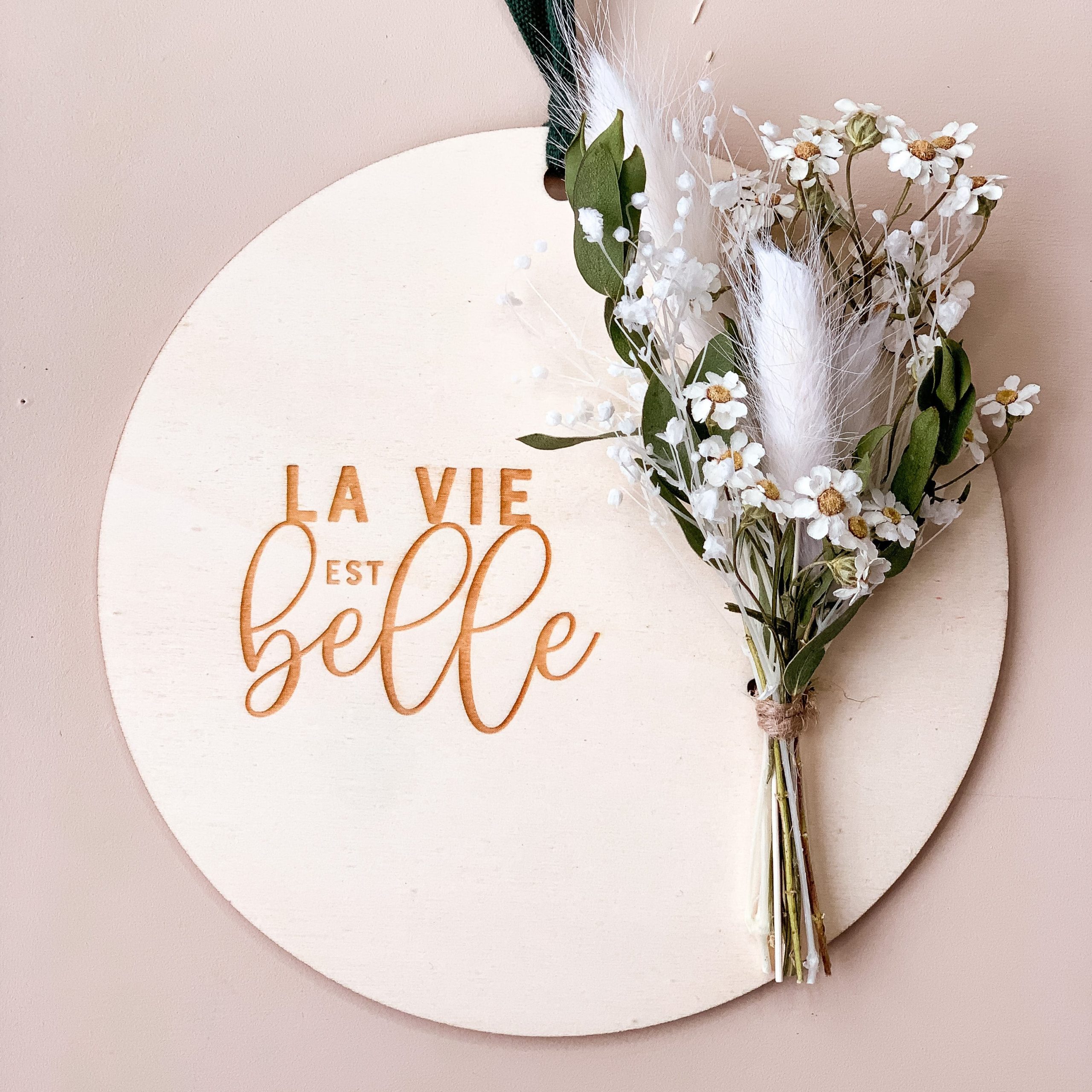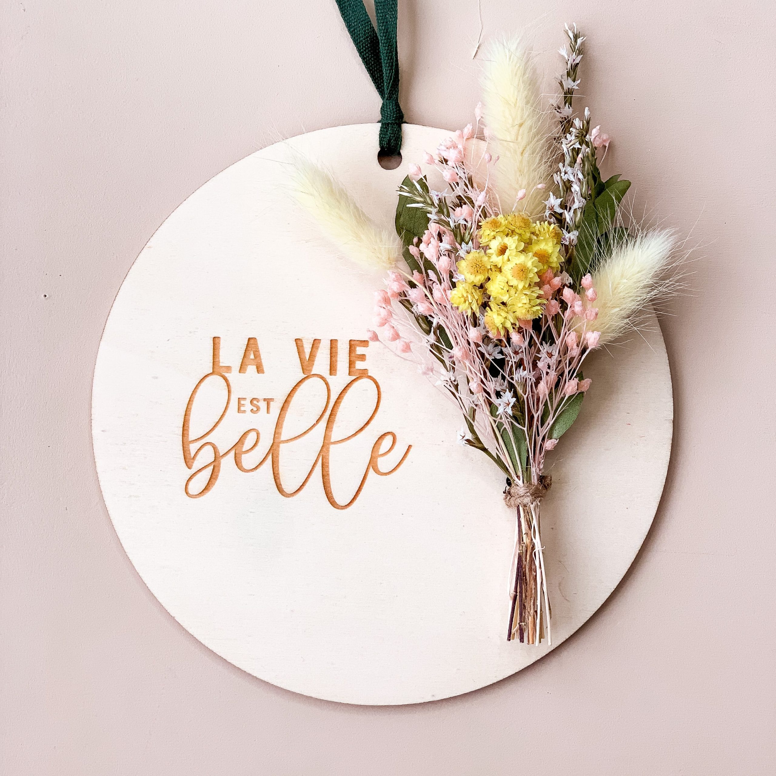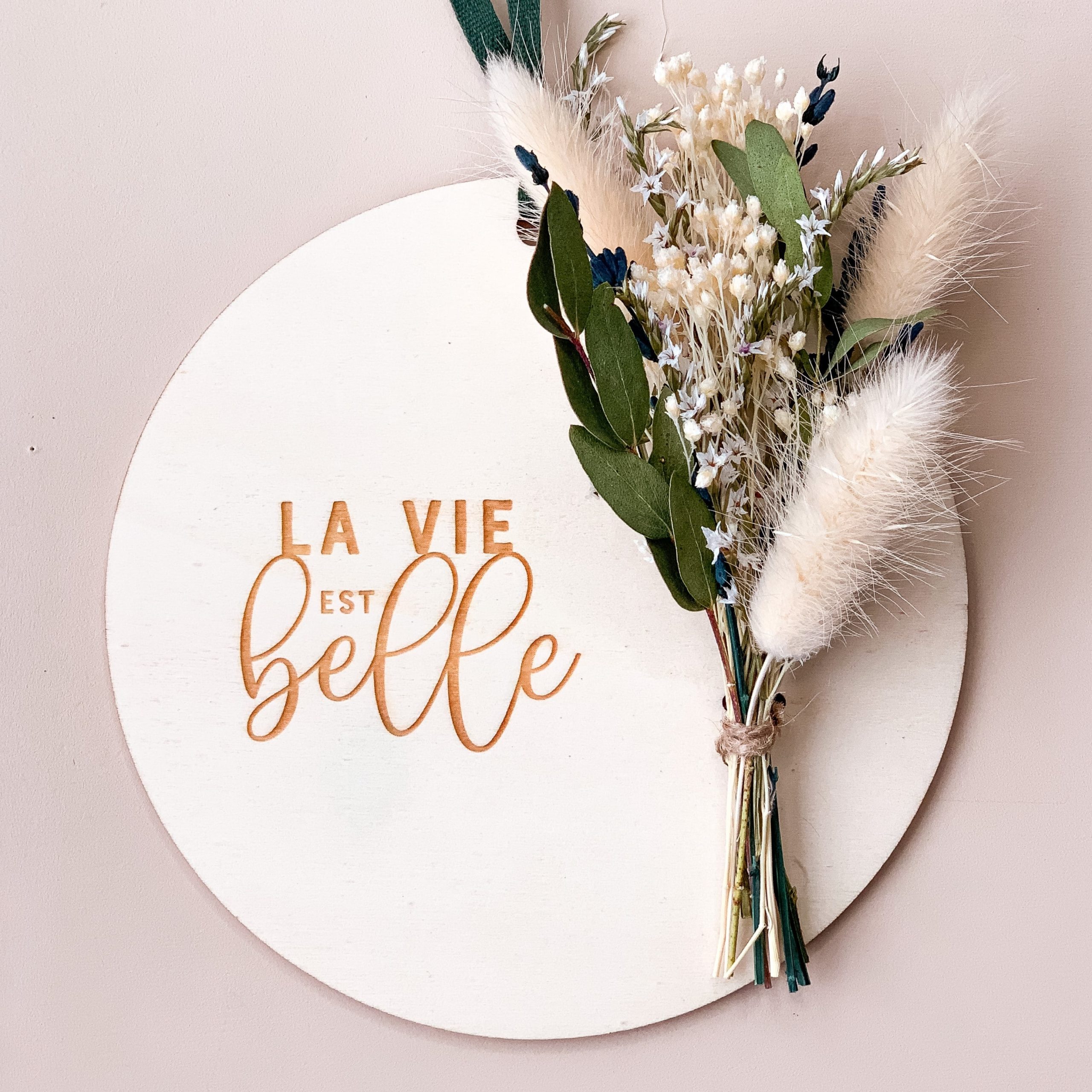 Cette jolie carte en bois est composée d’un délicat message "La Vie est Belle" et d'un bouquet de fleurs séchées aux couleurs de votre choix : nature, blanc, jaune ou rose !