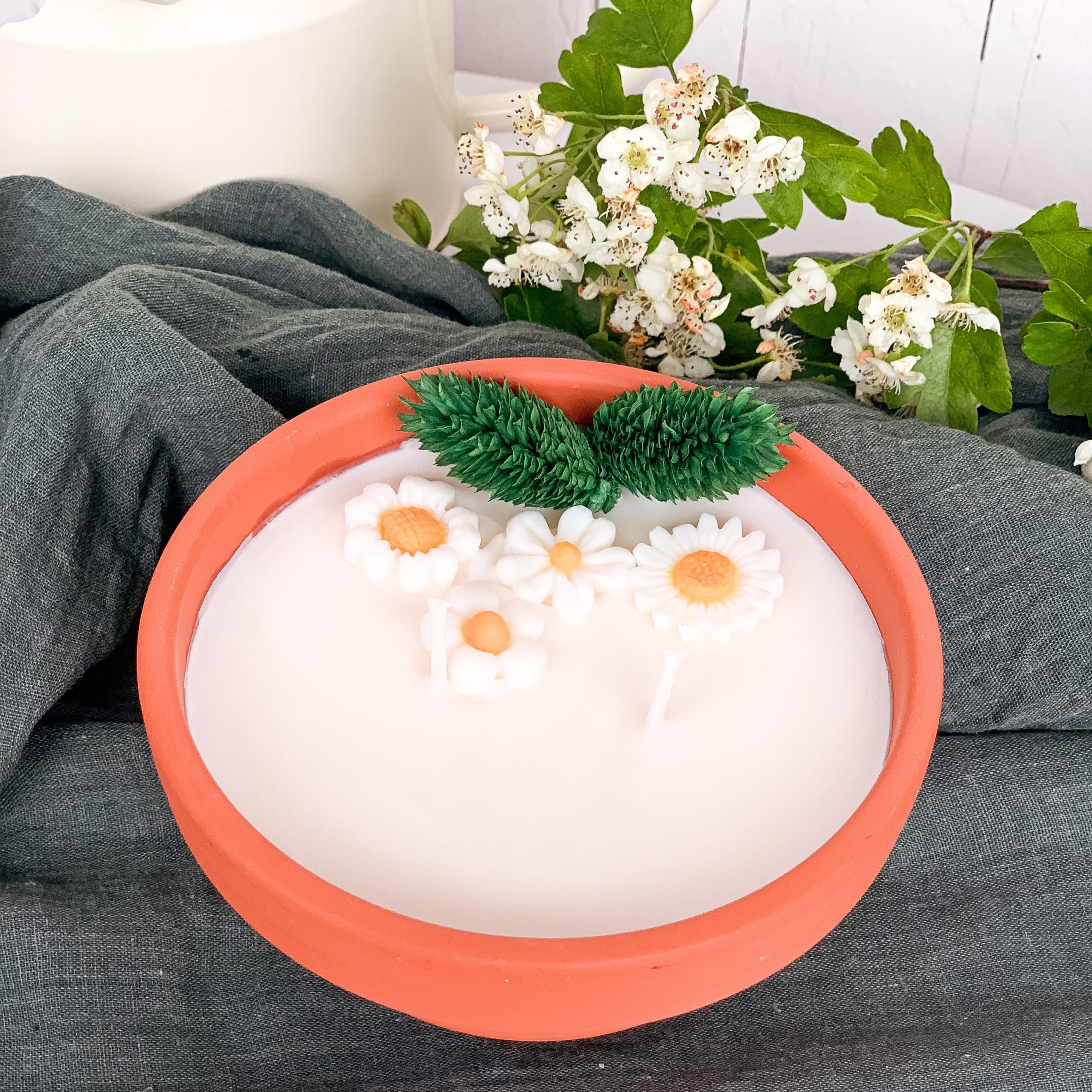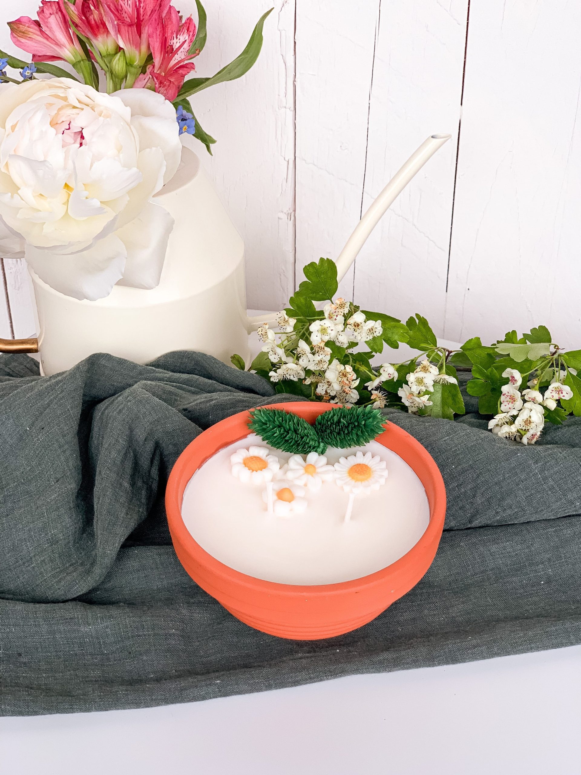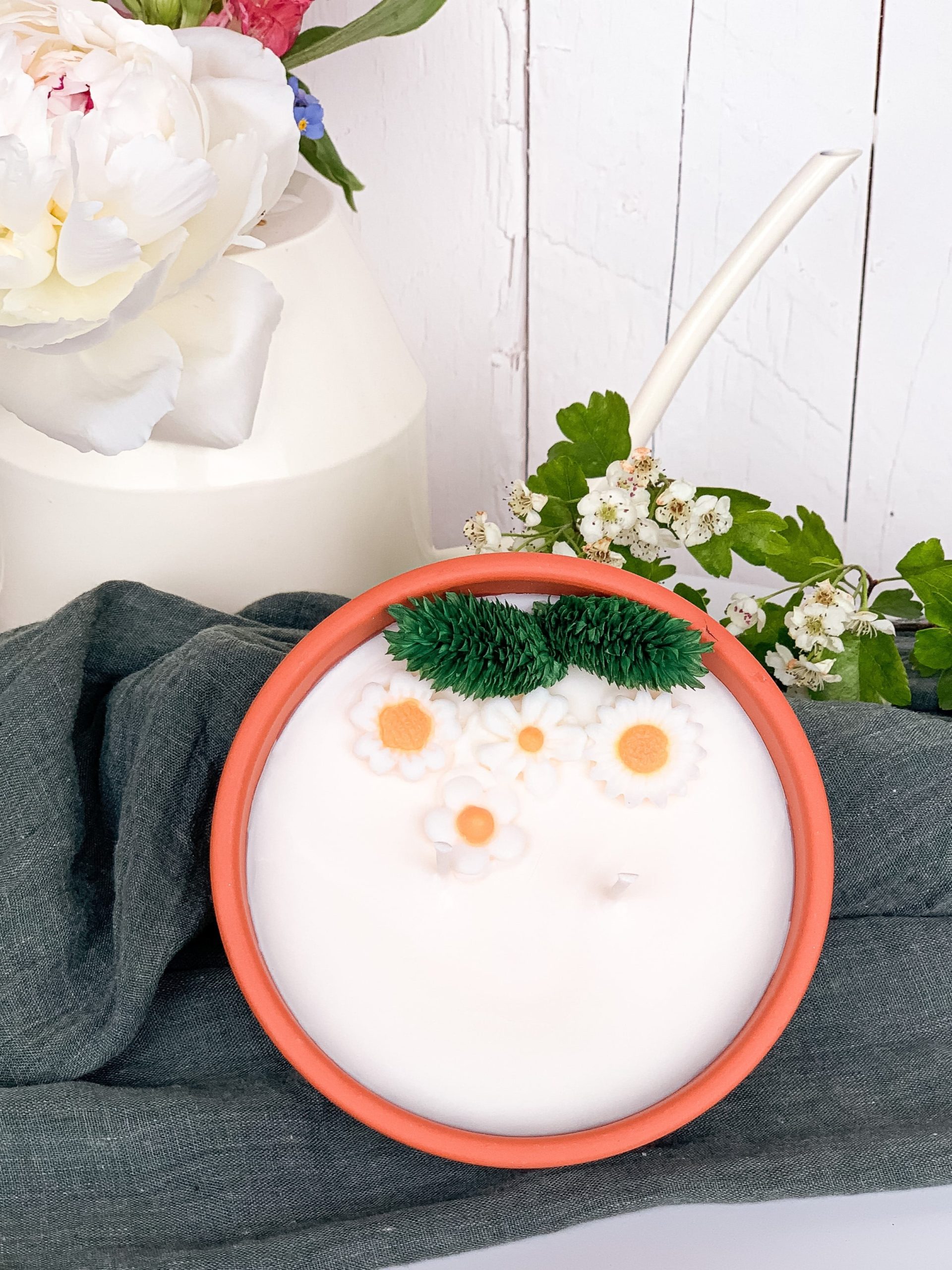 Découvrez les bougies minutieusement fleuries à la main avec des fleurs séchées et fondantes.