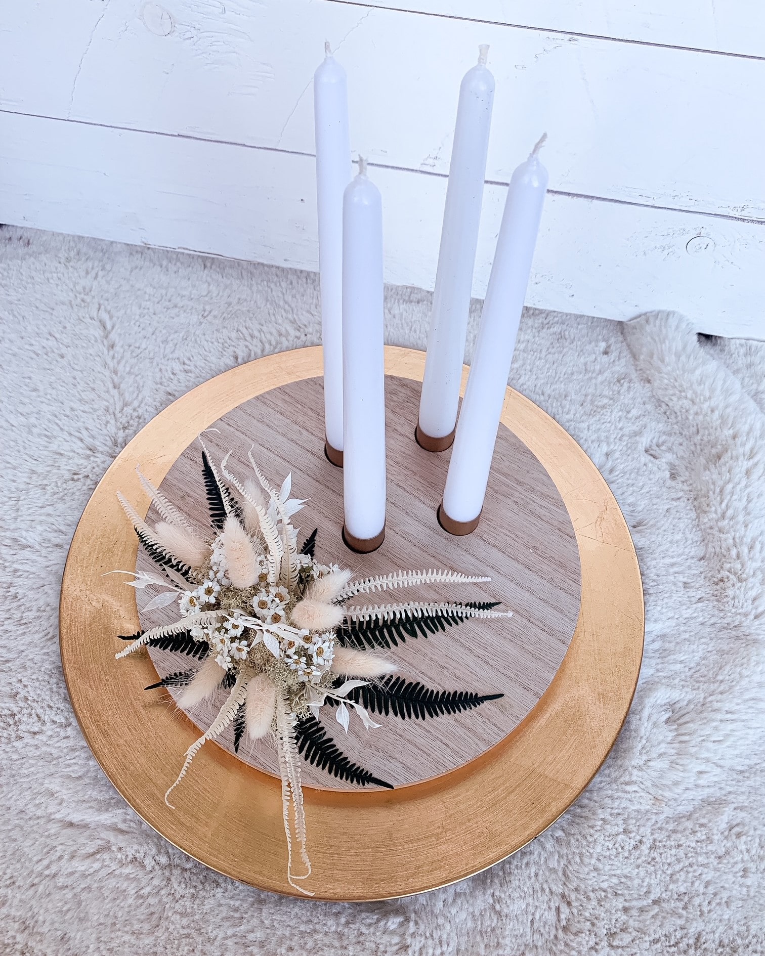 Ce jolie plateau doré accueil une structure en bois avec 4 bougeoirs qui en font une couronne de l'avent originale.
